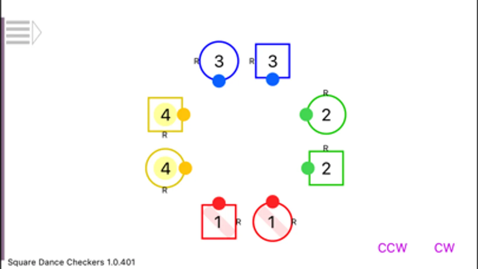 I found out that I needed to bring some square dance checkers to a square dance callers school I was attending later in the day. Looked and found out that the cats had got into and scattered all my sets of square dance checkers. (I found a head man checker with a #4/corner doll hiding behind the cat box. Maybe some of the others moved to Florida...) So I wrote this app. An iPad checker emulator. A couple other students in the callers school wanted a copy. So here it is.