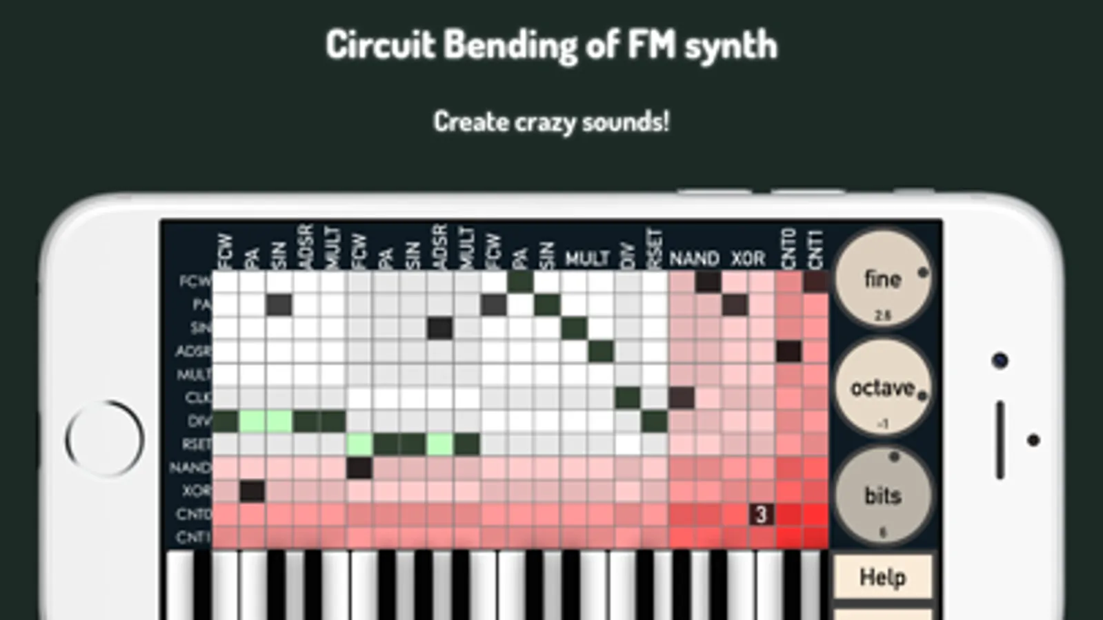 bent.fm is a full FM model of a circuit-bent synthesizer. bent.fm allows the user to tweak classic circuit bending modifications like fine and octave-decimated clock bends, and experiment with more esoteric bends. Circuit-bent distortions and algorithmic sequences can be created by (im)proper connections on the bend matrix. Reroute digital serial information through the base chip set (a numerically controlled oscillator) and extra logic gates (NAND and XOR, binary counters), and experience architecture-level bit crushing. For anyone interested in circuit bending, glitch sounds, industrial music, and post-procedural art.