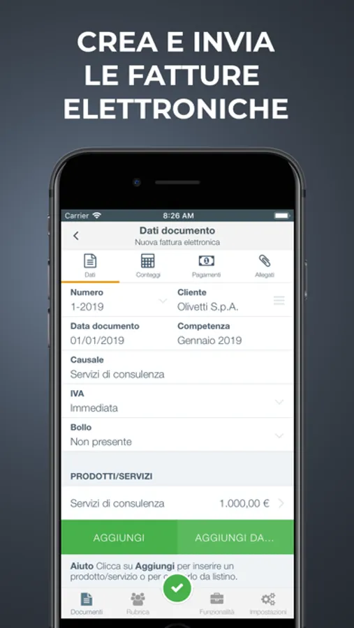 puoi creare fatture elettroniche, proforma, preventivi, ordini, note di credito, documenti di trasporto, e rapportini di intervento.