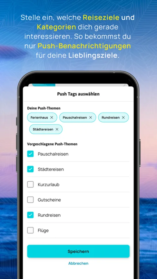 Besonders bei sehr preiswerten Last Minute Angeboten und Kurztrips heißt es oft: Schnell sein! Damit du keins der top Angebote verpasst, verfügt die Urlaubsguru-App über eine praktische Push-Funktion. Dadurch bekommst du die besten und günstigsten Angebote direkt und in Sekundenschnelle auf dein Handy. Das Gute daran: Du kannst selbst auswählen, für welche Angebote du Benachrichtigungen erhalten möchtest. Lege Kategorien und Reiseziele fest und lasse dich erinnern, wenn es ein neues, passendes Angebot für dich gibt. Diese Einstellungen kannst du jederzeit anpassen.