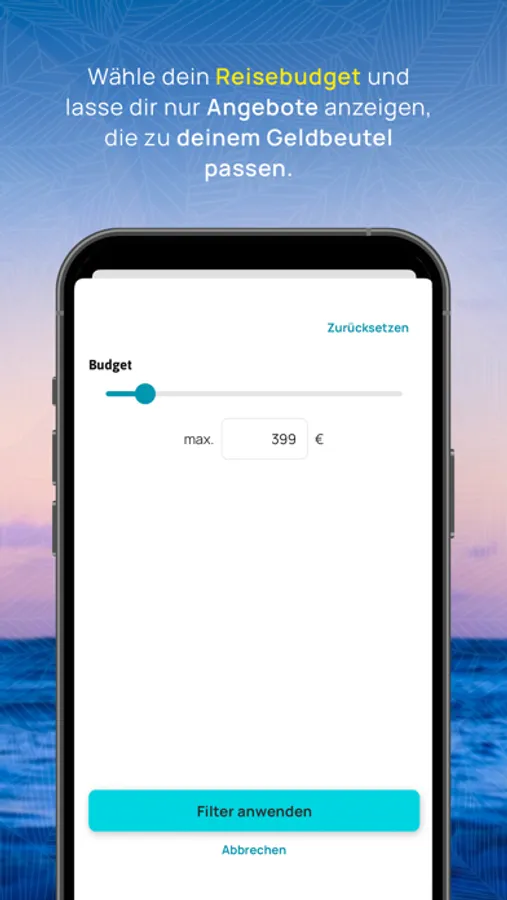 Wähle dein Reisebudget mit der praktischen Budget-Filterfunktion aus und lasse dir nur Angebote anzeigen, die zu deinem Geldbeutel passen. Damit fällt die Auswahl deutlich leichter.