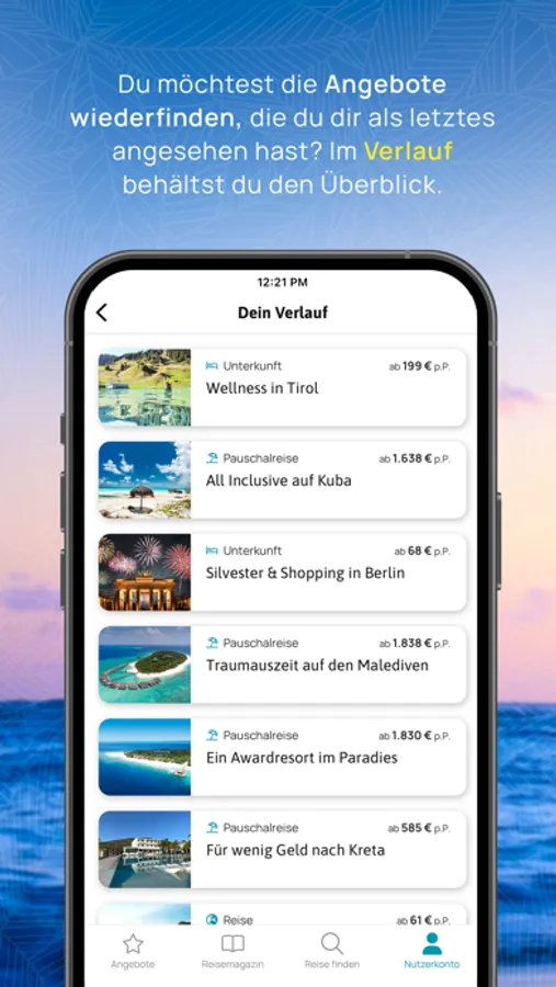 Du benötigst noch Ideen und vor allem passende Angebote für deinen nächsten Traumurlaub? Kein Problem! Stöbere einfach durch die verschiedenen Kategorien und lasse dir die aktuellen Reise- & Urlaubsangebote direkt anzeigen. Neben günstigen Pauschalreisen & Last Minute Angeboten findest du ausgewählte Pakete für Wellness Urlaub in Deutschland und Umgebung. Außerdem profitierst du von einmaligen Angeboten für Hotels sowie Flüge und kannst dir traumhafte Fernreisen anzeigen lassen. Auch das Buchen der nächsten Ski- oder Städtereise wird mit der praktischen Reise-App zum Kinderspiel.