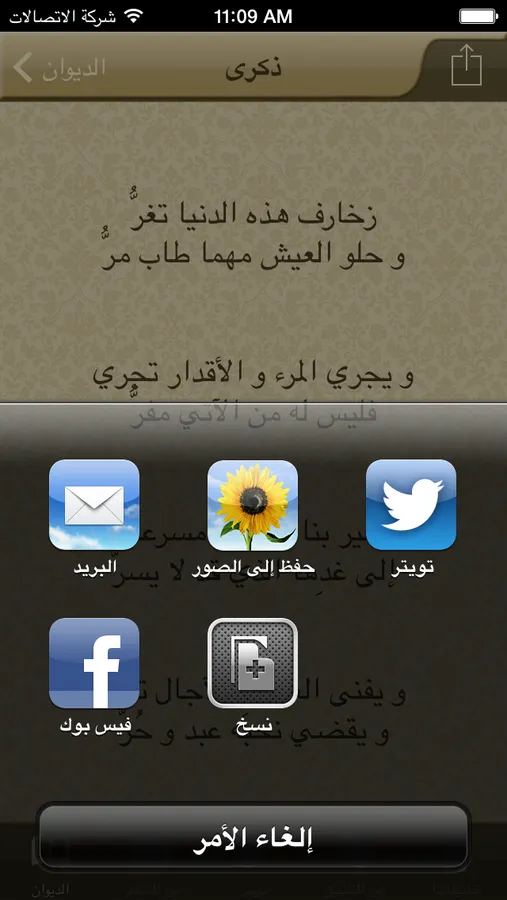 ـ مشاركة القصيدة عبر الفيس بوك والبريد والرسائل ـ