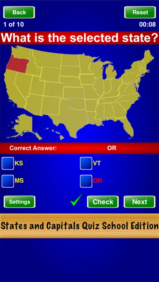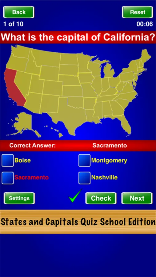 Test your knowledge of the states and capitals of the U.S. Select the test mode, difficulty level, and number of questions in the "Settings" screen. Play until you master the game.