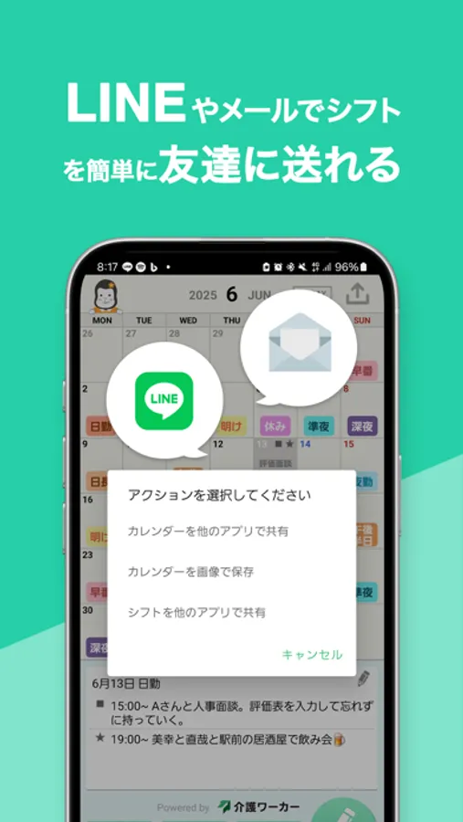 スケジュール共有:LINEやメールで簡単共有。シフト調整もスムーズ