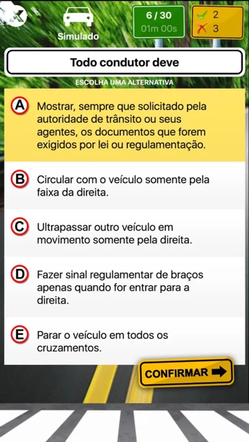 Este é o modo de simulação oficial, onde 30 perguntas são aleatoriamente selecionadas e você deve acertar pelo 21 para passar no teste.