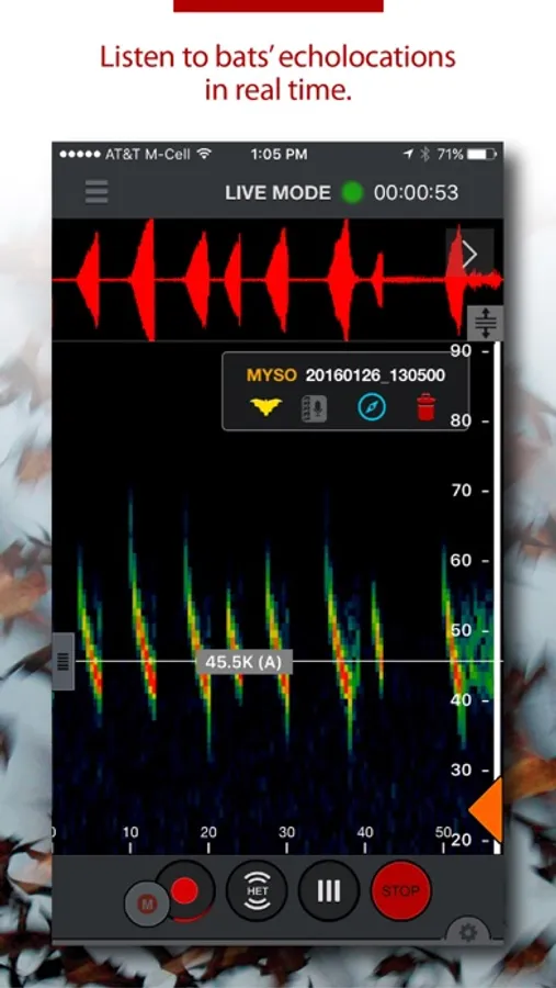 Activate triggered recording mode to automatically save bat passes to full spectrum .wav files for analysis on a computer or to view on your iDevice. Or use manual record mode to control start and stop of recording. View the recording spectrogram and add voice or text notes. Listen to the recording using RTE, HET, or traditional Time Expansion Playback (playback at fractional speed to make the ultrasound audible).