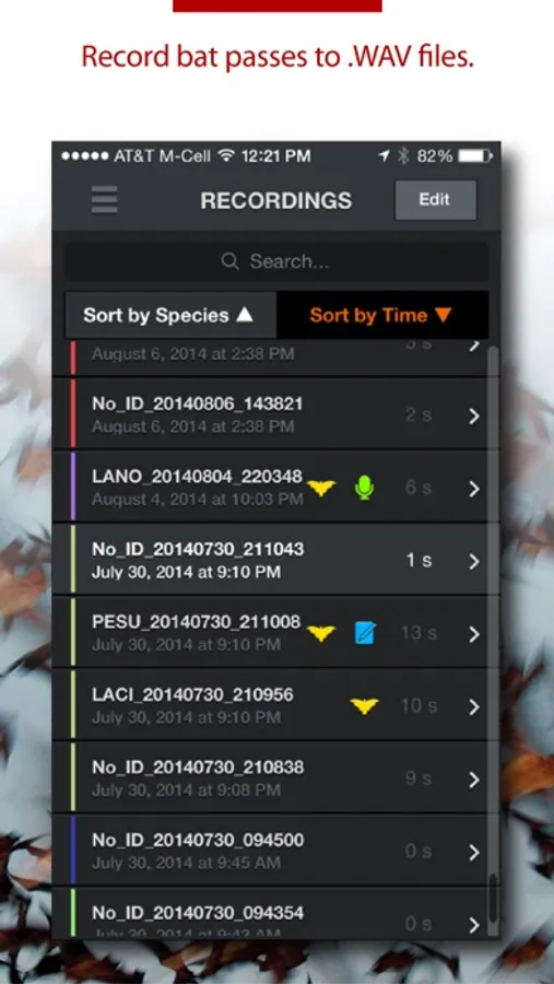 The Auto ID feature analyzes the echolocation calls and suggests the two most likely bat species matches in real time. This is the same technology used in our professional Kaleidoscope Pro Bat Auto Identification software. Currently, the app can identify 26 species in North America, 25 in Europe and 57 in the neotropics. For more information on Kaleidoscope and a full list of species, visit our website.