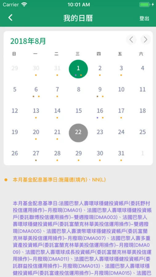 .我的日曆_保戶專屬保單資訊、基金的配息基準日、投資帳戶撥回基準日、人事行政局公告放假日。
