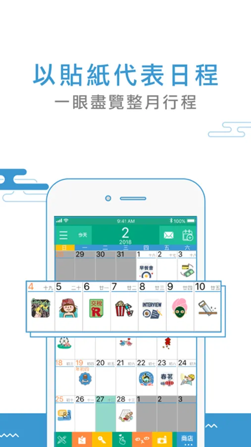 ・可在月曆上自訂顯示1, 2, 4 或6項日程貼紙