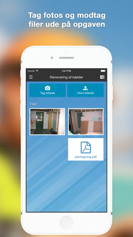 Den kørende medarbejder tager et billede, som kollegerne på kontoret kan se. Derved kan han få et hurtigt svar på, hvad der skal gøres ved opgaven, om der skal bestilles materialer eller maskiner, om der er brug for en ekstra mand på stedet osv. Billedarkivet kan også bruges til filer, som f.eks. projektbeskrivelser, tilbud, tegninger mm., så medarbejderen altid har de nødvendige oplysninger ved hånden.