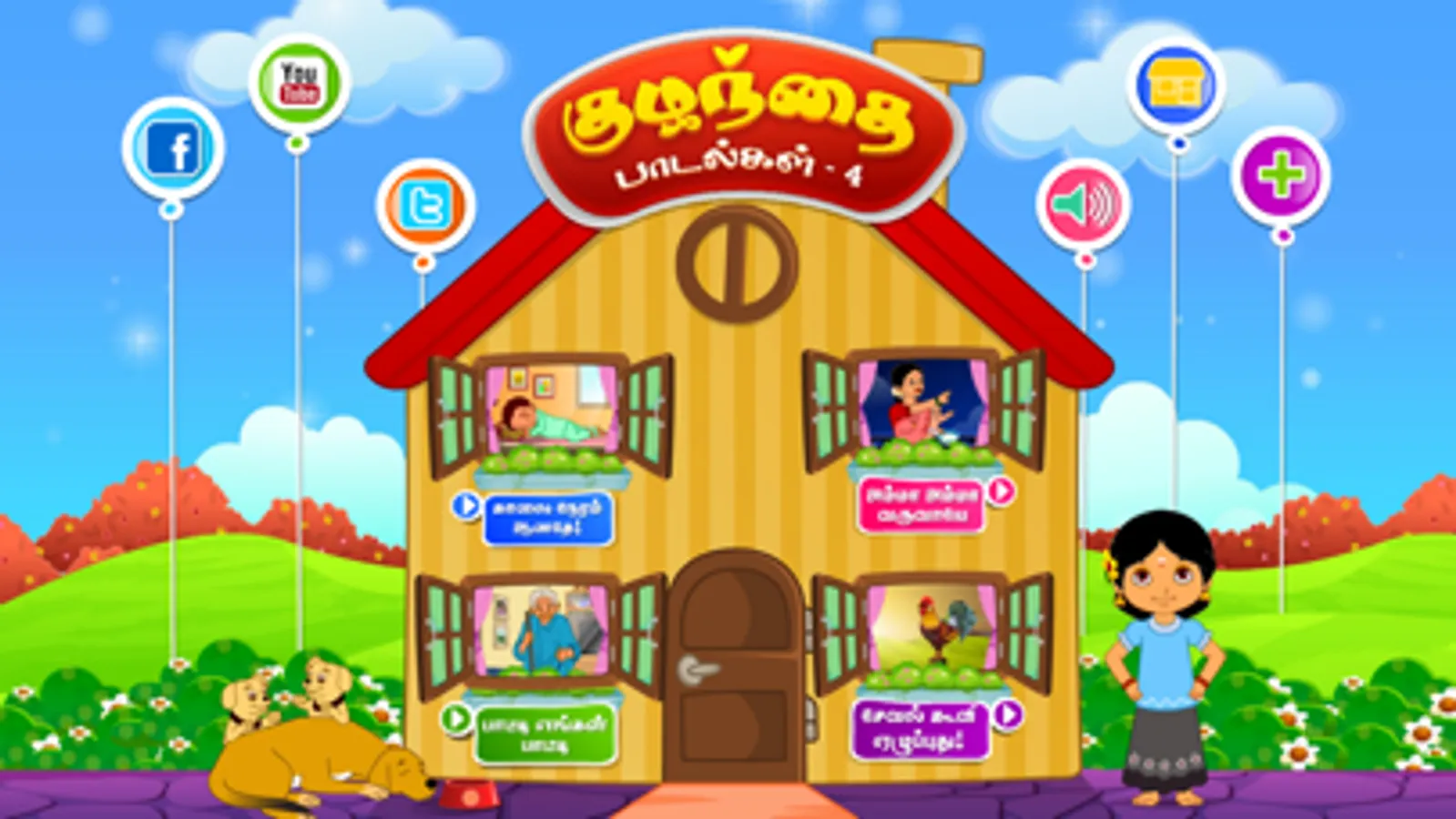Tamizh Kids Rhymes (Tamizh Kuzhanthai Padalgal), A wonderful Nursery Rhymes app for your kids with songs, music, animations and sing-along. A fantastic app for kids featuring Five popular Nursery Rhymes.