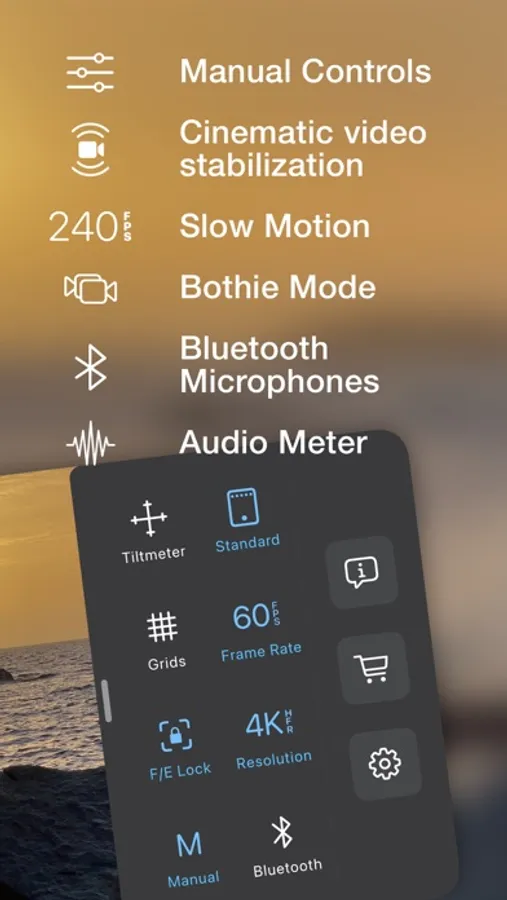 Capture breathtaking videos in HD & UHD 4K with frame rates from 24 fps to 240 fps HFR. ProCamera offers Auto, Semi-Auto, or Manual controls for video Exposure, Focus, and White Balance. Enjoy support for H.265 (HEVC), ProRes 422 incl. ProRes HQ, Dolby Vision HDR Video, High Bitrate Recording, Audiometer, and Stereo Audio. Connect Bluetooth, Lightning, or USB microphones for enhanced audio quality.