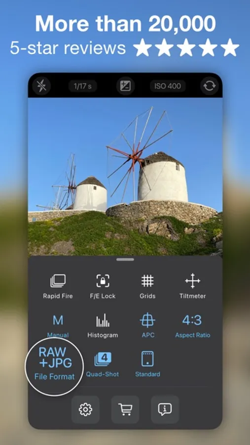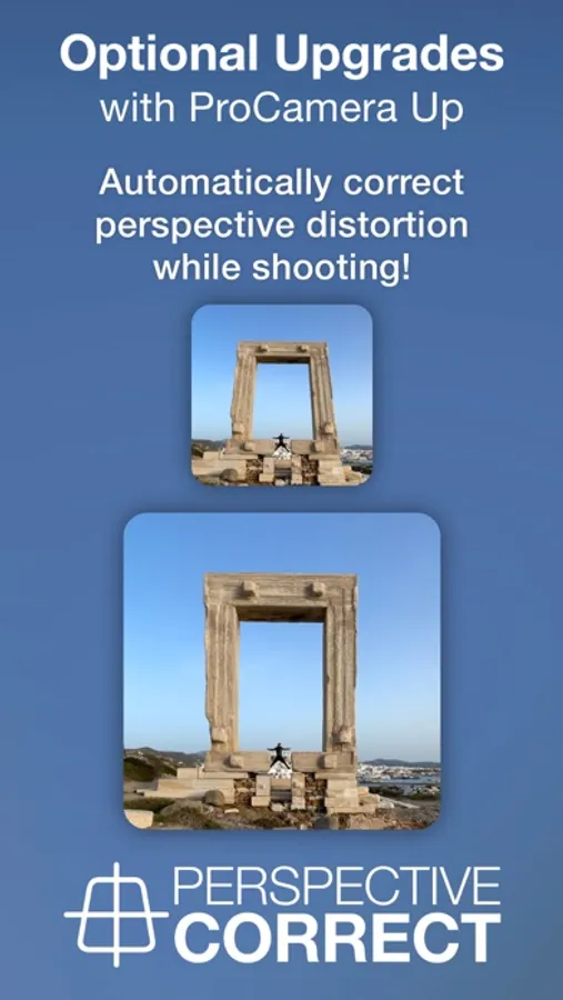 Upgrade to ProCamera Up for access to exclusive features such as Auto Perspective Correct for professional-looking photos free of perspective distortion, Custom Camera Presets (Exposure, WB, Focus) for an efficient and personalized shooting experience, (RAW) Exposure Bracketing, safeguarded Private Lightbox folder, and specialty photo filter sets. The upgrade is available as a one-time purchase or as a subscription.