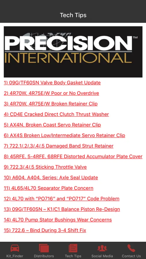 Precision International Automotive Products, Inc. is proud to offer our “Kit Finder” app to help you at the workbench. Use our app to not only identify what automatic transmission is in the vehicle you are working on, but also determine the Precision International overhaul, banner, and master kit part numbers associated with that transmission. Our app gives you the power to locate your nearest distributor and call them on the spot. Our tech tips and social media pages are constantly updated to bring you the most useful and up-to-date new product announcements, video seminars and parts catalogs to make your job at the workbench easier.