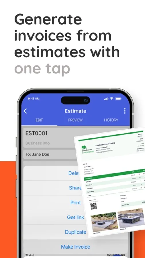 Easily create & send professional invoices, estimates, and receipts on the go! The perfect tool for individuals and growing businesses that lets you quickly create a document on the spot while with your customer.