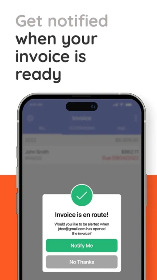 Send your invoice or estimate by email, text, WhatsApp, or download it as a PDF. Get instant alerts when it's opened, paid, or is overdue with instant mobile device and email notifications.