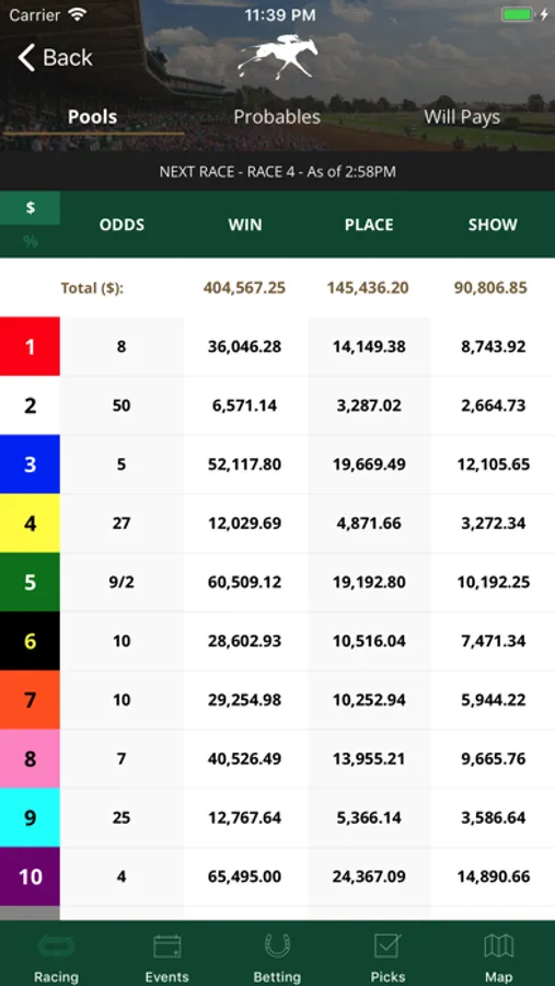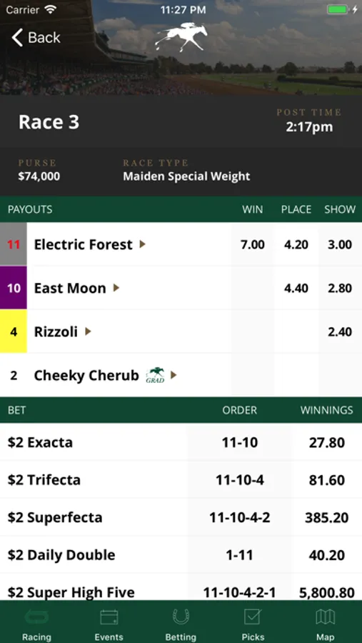 Select your favorite horses in upcoming races and save them for future bets (just like circling horses’ names in the program) and view race results.