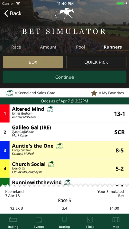 Use the Bet Simulator to calculate and save your bets on your phone so you know how much they cost and you’ll be prepared to place your bets when you get to the window.