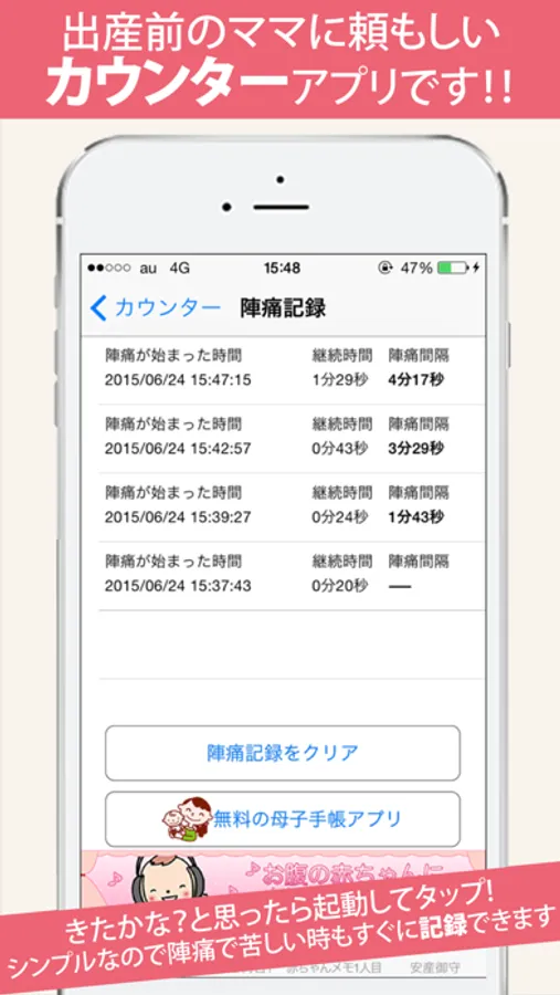 ・陣痛が来る度にストップウォッチをタップすることで、陣痛の間隔が記録されます。