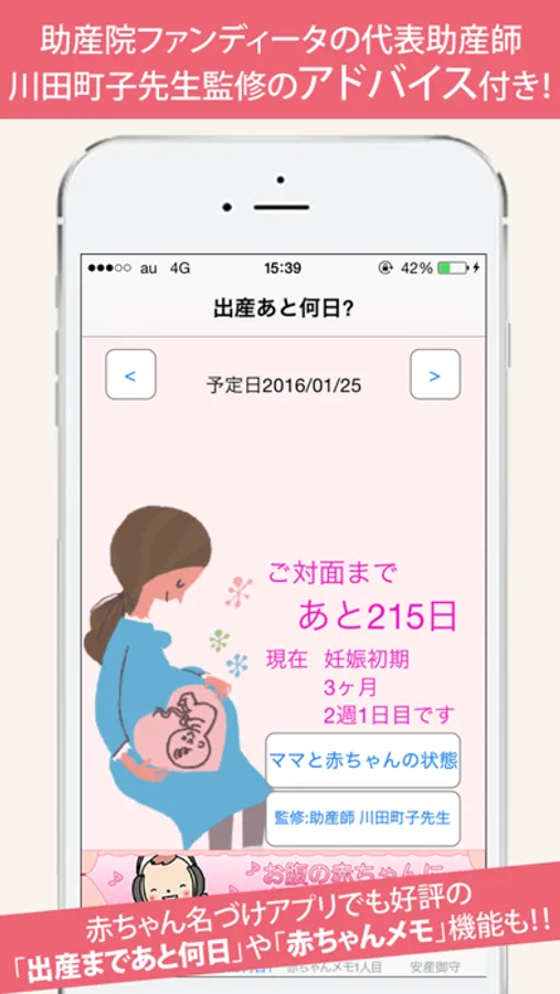 赤ちゃん名づけでも好評だった「出産まであと何日」「赤ちゃんメモ」機能も搭載。