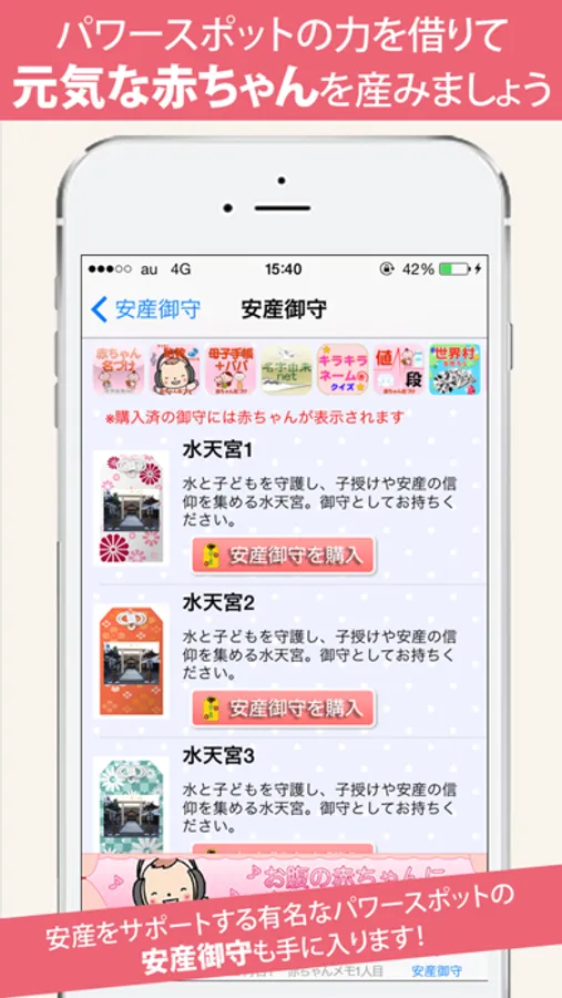 ・「安産の御守」として、日本各地の強力なパワースポットの生写真を購入することができます。