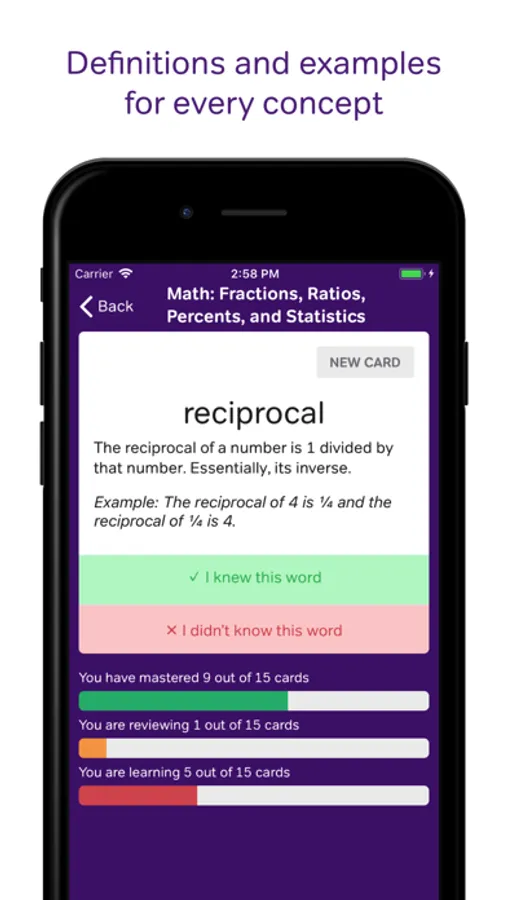 Academic research has found that memories are formed by repeated exposure to new information, so Magoosh’s flashcard app uses a spaced repetition system. Concepts and words you are learning will reappear frequently (occurring less frequently the better you know them) and words you already know won’t be repeated.