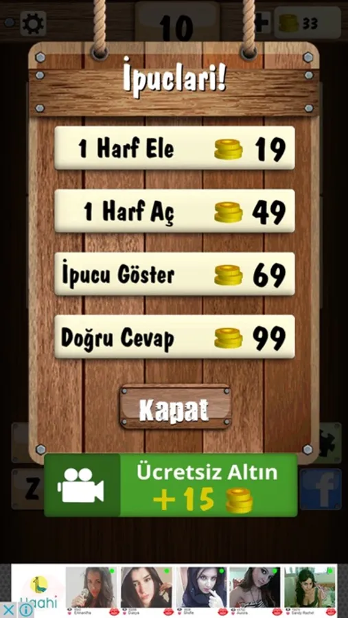 - Altınlarınız ile ipuçlarına ulaşın, doğru kelimeyi bulun!