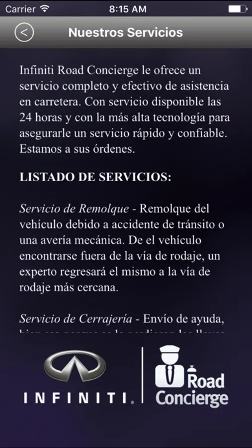 Infiniti Road Concierge le ofrece un servicio completo y efectivo de asistencia en carretera. Con servicio disponible las 24 horas y con la más alta tecnología para asegurarle un servicio rápido y confiable. Estamos a sus órdenes.