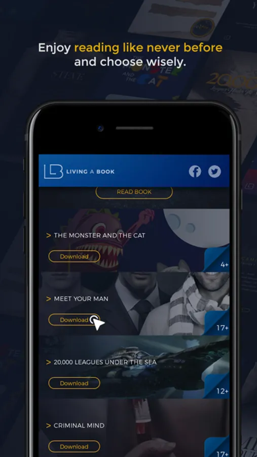 Interactive book with multiple endings. "Living a Book" is a new approach to interactive books where your decisions change and trigger new stories and a new ending.