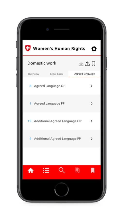 The W’sHR App is a pioneering endeavour by the Swiss Federal Department of Foreign Affairs and the Swiss Centre of Expertise in Human Rights/ Interdisciplinary Centre for Gender Studies database and was developed to facilitate the often challenging and time consuming UN-negotiations. The App is based on a digital database and provides guidance on key issues related to the human rights of women, including international legal instruments and agreed language contained in over 550 documents on women’s human rights adopted by UN bodies such as the General Assembly, Human Rights Council or ECOSOC. The App also provides key paragraphs based on the annual sessions of the Commission on the Status of Women (CSW) and the Committee on the Elimination of Discrimination against Women (CEDAW). The user’s search is facilitated by keywords which cover crucial topics ranging from «Abortion» to «Sexual abuse» and «Widows». The App will regularly be updated with new documents and emerging issues. The latest add-ons are keywords featuring legal instruments on «Women journalists», «Sport and gender» as well as «Digital/cyber violence and harassment». This provides a basis for convincing arguments and enables more coherent and efficient negotiation processes to make further progress in the field of human rights and gender equality. The W’sHR App is user-friendly and intuitive. New features allow users to bookmark relevant language and take notes within the app.