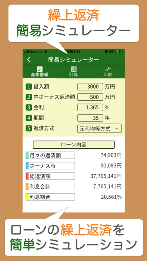 繰り上げ返済を簡単にシミュレーションできる、住宅ローン計算アプリ。面倒な計算を簡単にしてくれるので、手軽にローン返済シュミレーションができる、便利な無料アプリです。