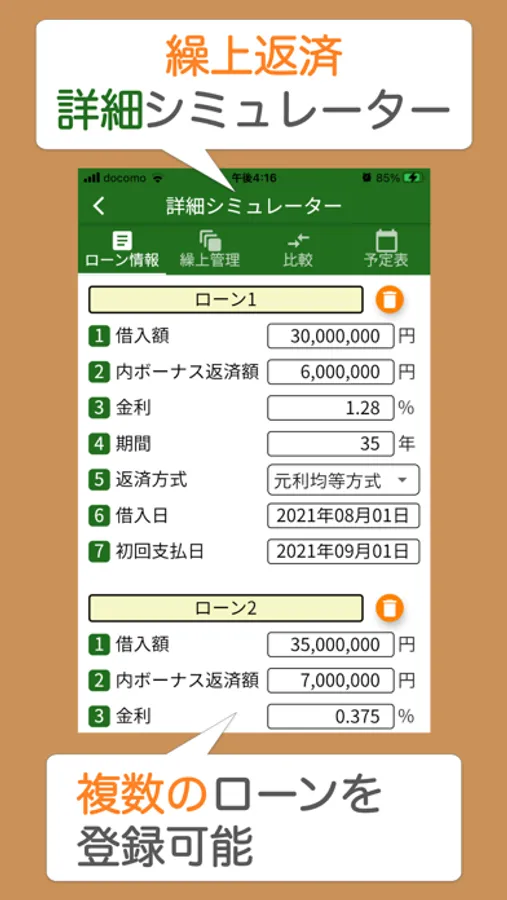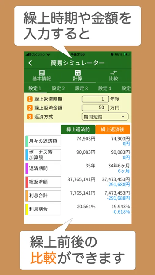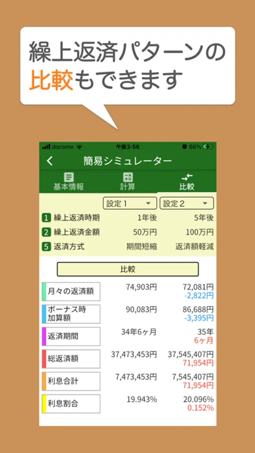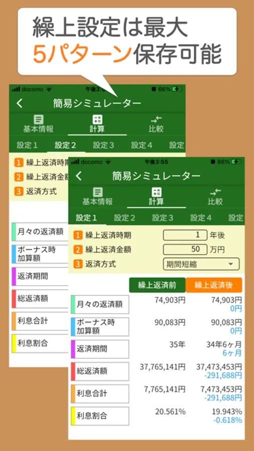 繰り上げ返済パターンを最大5つまで保存でき、それぞれを比較することができます。