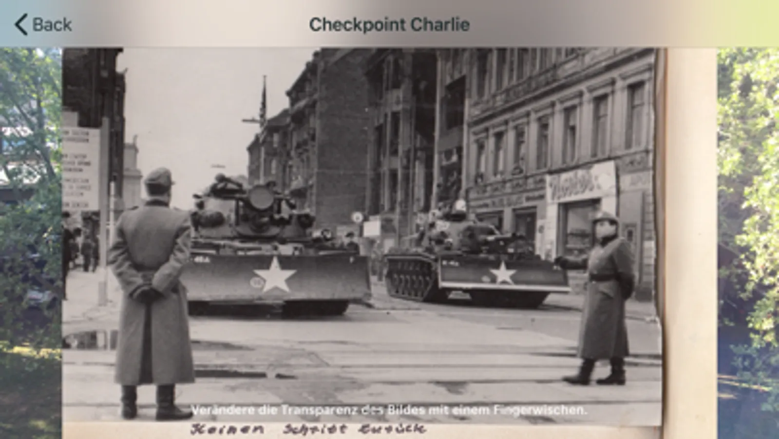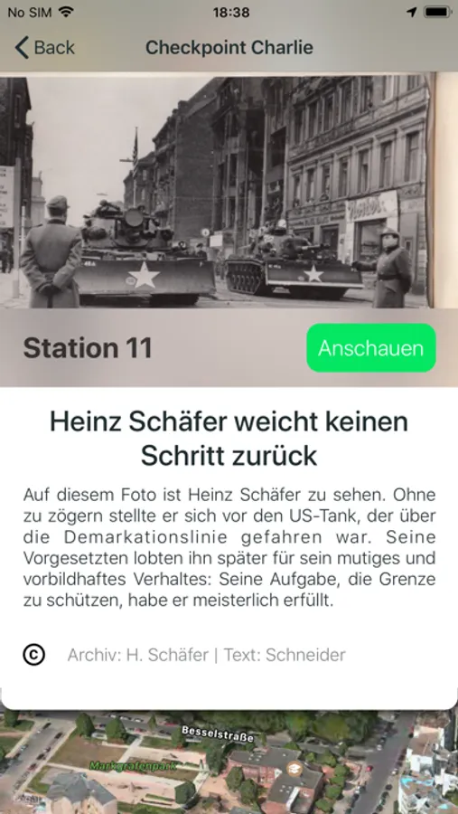Die Mauerschau öffnet virtuelle Zeitfenster, durch die du Geschichten zum Bau und Fall der Berliner Mauer nacherleben kannst. Zeitzeugen führen dich persönlich an die Orte des damaligen Geschehens. Fluchtgeschichten, Tunnelbau, die Sprengung der Versöhnungskirche und die Panzerkonfrontation am Checkpoint Charlie werden über Fernsehaufnahmen aus ost- und westdeutschen Filmarchiven sowie Originalfotos in Augmented Reality wieder sicht- und nachvollziehbar. Wähle aus einer Vielzahl unserer Zeitzeugen-Touren aus und entdecke deine persönliche Berlingeschichte.