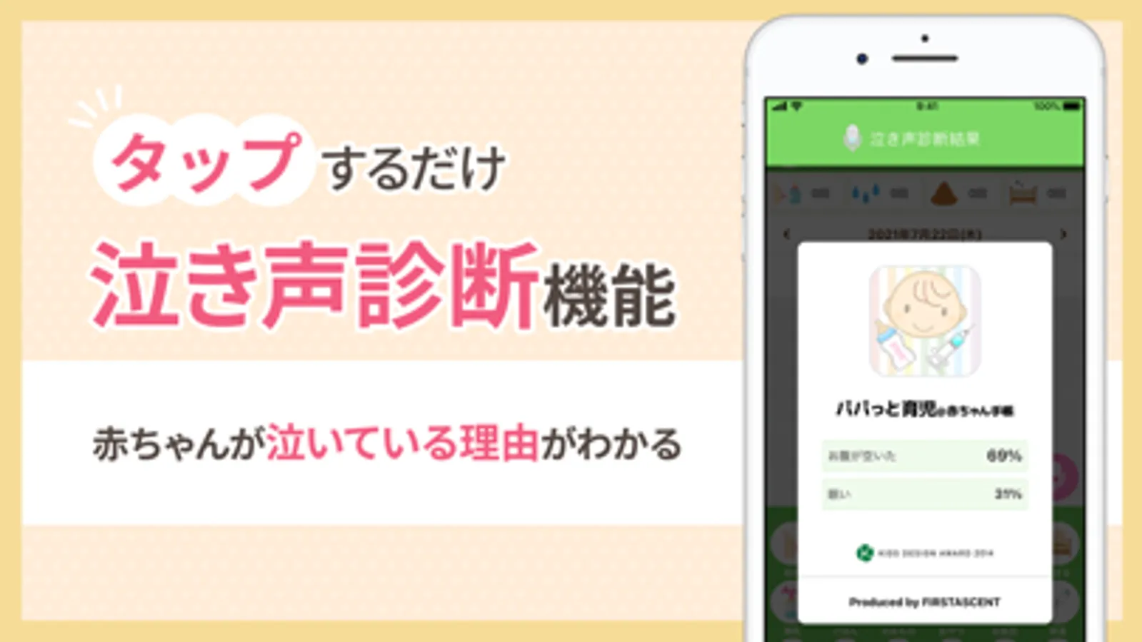 赤ちゃんの泣き声から感情を分析する泣き声診断機能あり。予防接種管理など、母子手帳アプリとしてもご利用頂けます。