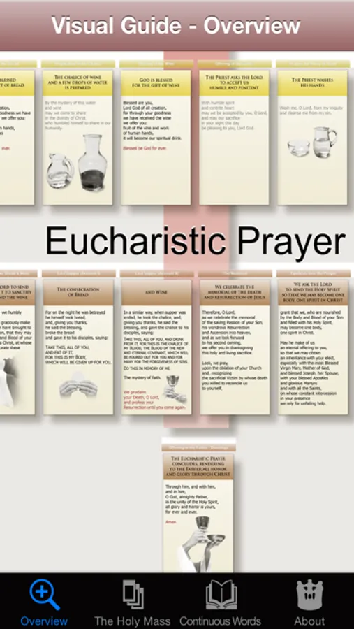 The Visual Guide To The Holy Mass (Visual Guide) is a graphical representation of the Order of Mass. As a catechetical tool, it complies with the Catechism of the Catholic Church 1346, 1347 and therefore, it is divided into two parts: the Liturgy of the Word and the Liturgy of the Eucharist, that form a fundamental unity. The Visual Guide's intention is to become a learning tool for families, so they may participate more fully in the Eucharist. Families share their faith and exchange learning experiences through interpersonal relationships and dialogue, often 'on the go'; in long car or train journeys, while walking, and during family outings. The founder of School and Family C.I.C., the initiator of this app, desires that The Visual Guide To The Holy Mass becomes the 'mobile' point of reference for families. The source and inspiration for this app is the work of Maria Montessori and Sofia Cavalletti.