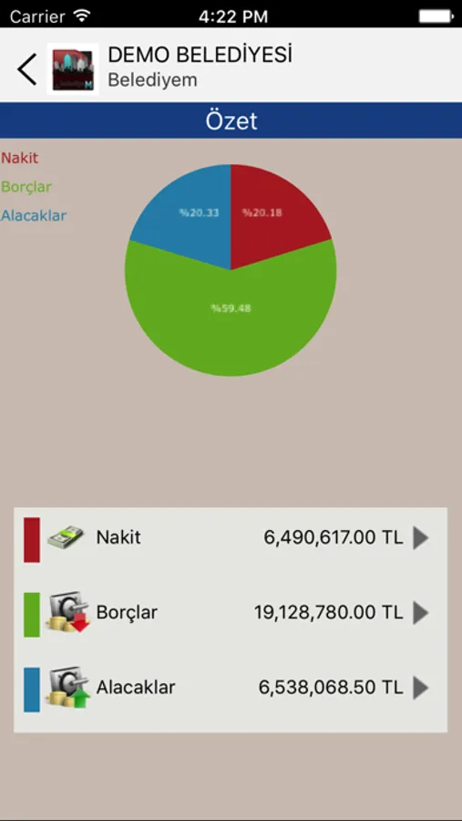 •Özet: Nakit, borç ve alacaklarla ilgili özet bilgiler pasta ve çubuk grafikler ile birlikte gösterilir.