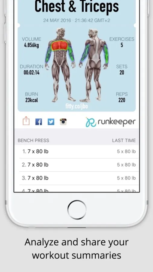 - Share workouts: Facebook, Twitter and Runkeeper integration