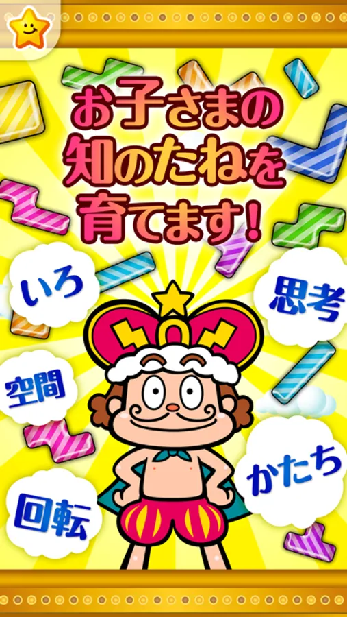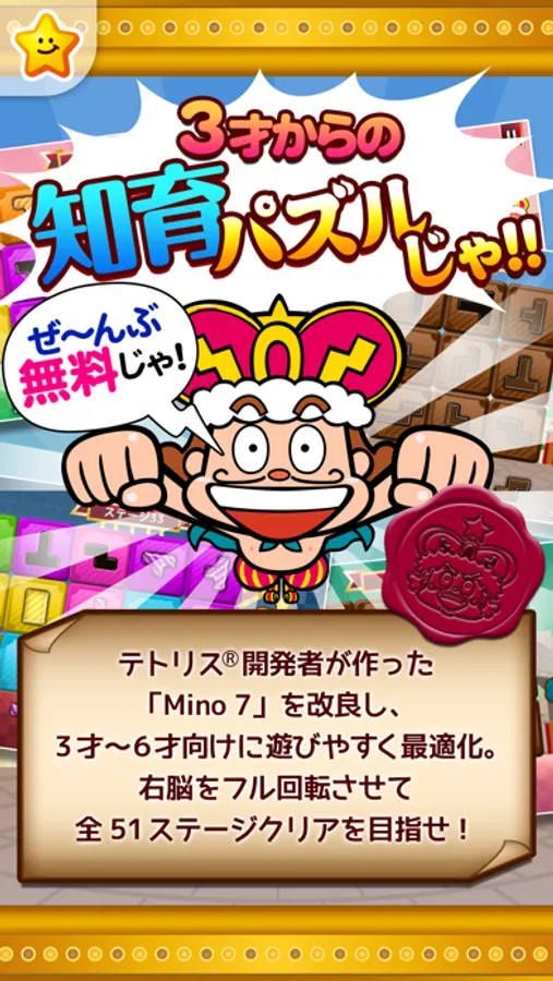 幼児期からの右脳の活性化と能力向上にフォーカスし、有名な教育パズルゲーム「TETRIS(テトリス)」の開発者が作った「Mino 7」を幼児向けに改良した、パズルと絵本(物語)を組み合わせたまったく新しい形の無料知育ゲームアプリです。