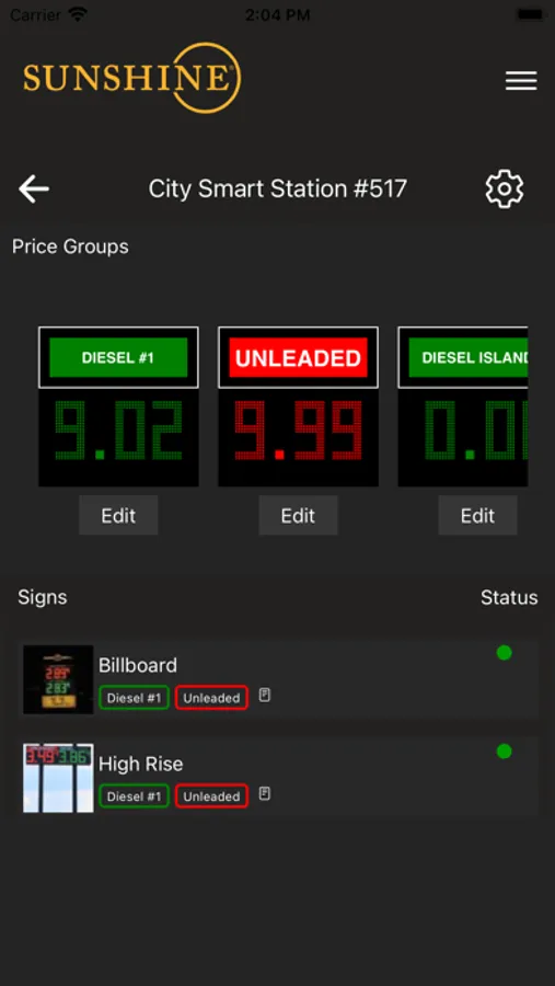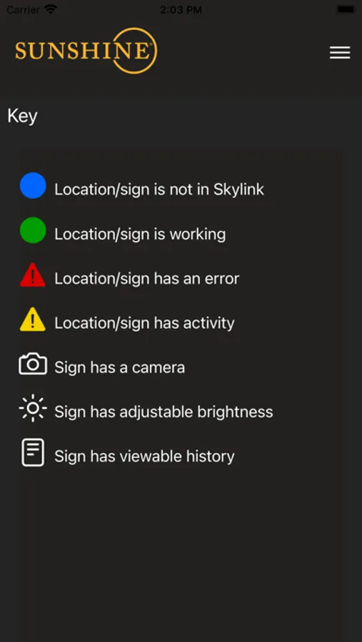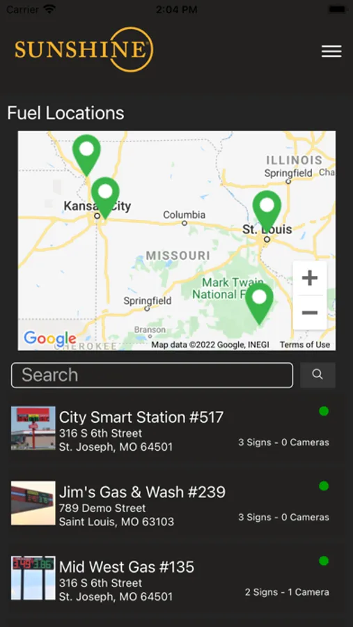 Skylink is an application for customers of Sunshine Electronic Display Corporation to manage their signage using Sunshine’s proprietary technology. Customers will be able to view their signs on a digital map, see current values of signs, locate sign errors, change configuration, and update values.