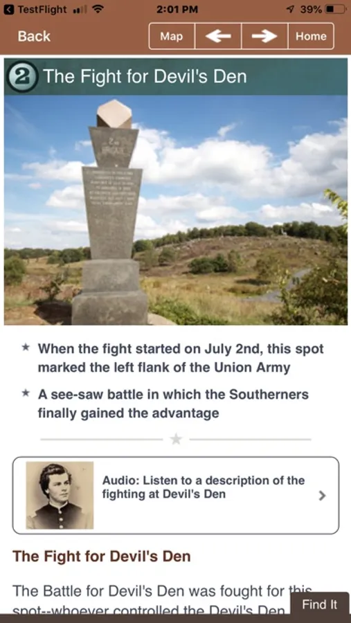 The Gettysburg Battle App®: July 2 is the perfect tour partner for your visits to some of the Gettysburg battlefield's most famous places, Devil's Den and Little Round Top. This GPS-enabled tour app focuses exclusively on the July 2, 1863 fighting and provides in-depth detail on the action that took place on this iconic historical landscape. Click on our "virtual signs" to access a wealth of information related to the very location where you are standing. Onboard historian videos, audio accounts from soldiers and civilians, photos, facts, and more are just a click away. Never has so much information been made available in such a portable device!
