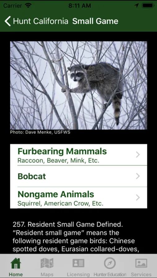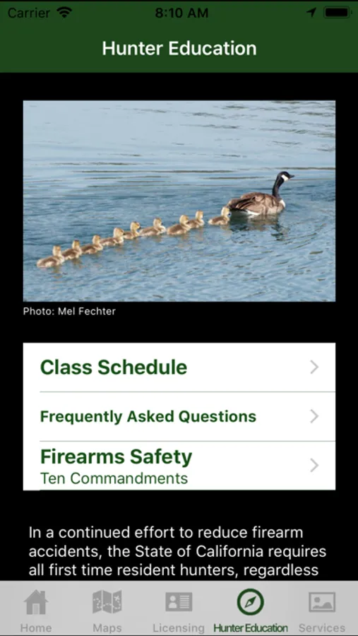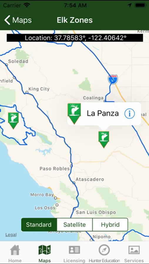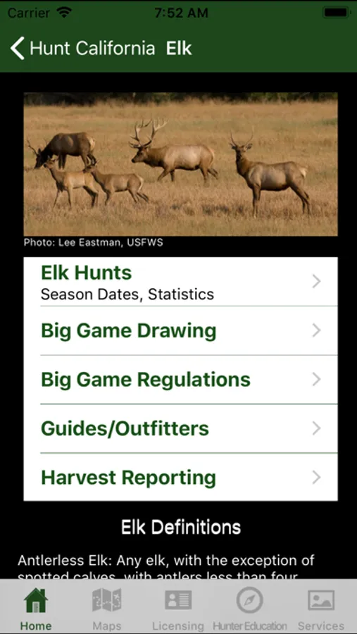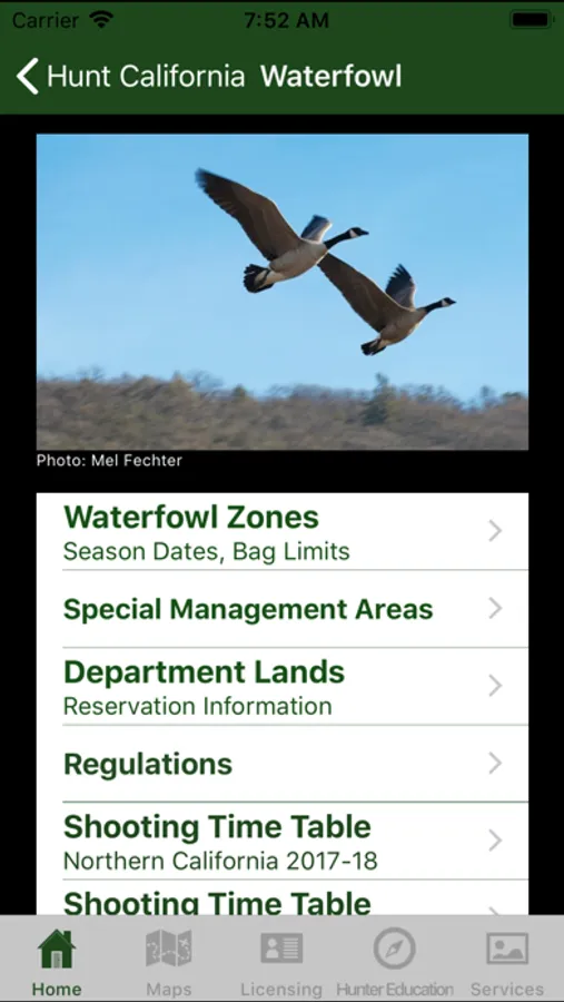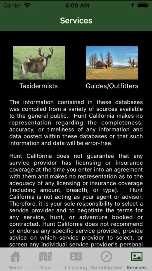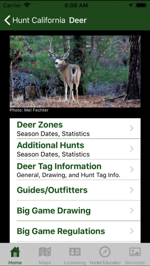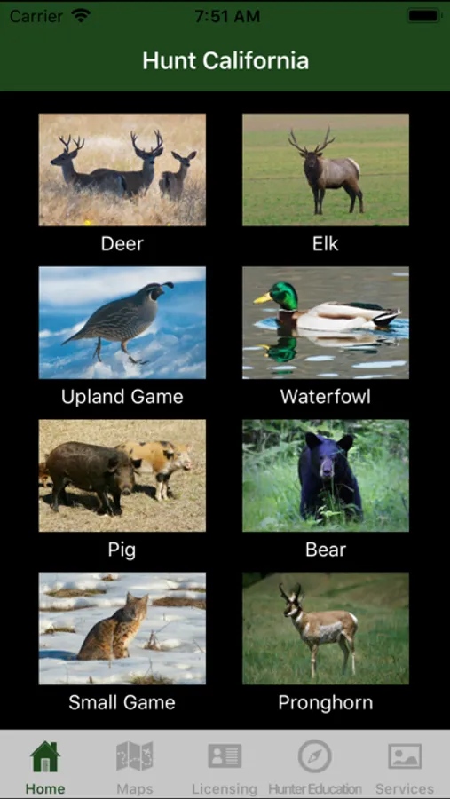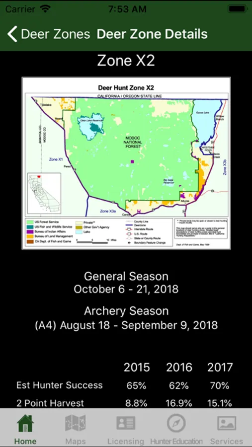 A reference app containing legislative and other information pertaining to the legal sport hunting of animals in the state of California. Includes season dates and bag limits for big game such as deer, elk, bighorn sheep, pronghorn antelope, bear, and wild pigs; waterfowl, small game, upland game birds; hunting zones and boundaries, big game drawing and harvest statistics. Also contains maps used to outline established zones and hunt areas, and show the user's location in relation to those boundaries.