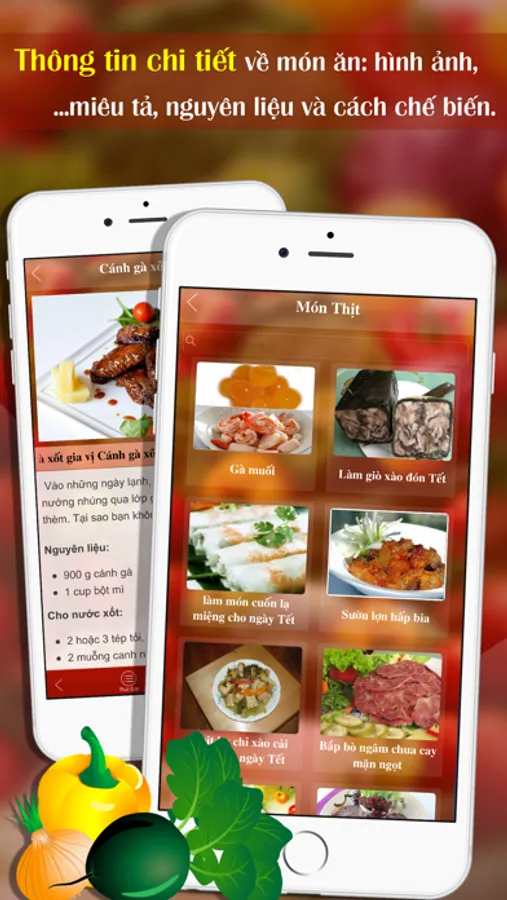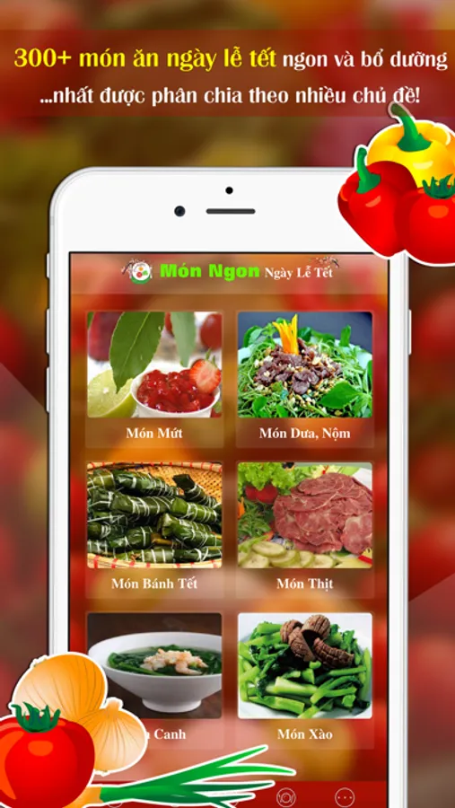 ► "Món Ăn Ngày Lễ Tết" cung cấp cho quí vị danh sách hơn 300 món ăn ngày tết ngon và bổ dưỡng nhất được phân chia theo nhiều chủ đề: món mứt, dưa nộm, bánh tết, món thịt, canh, xào… Mobile510 mong muốn ứng dụng sẽ là cuốn cẩm nang nấu ăn giúp người nội trợ có thêm kiến thức về các món ăn gày tết ngon và bổ dưỡng nhất, giúp không khí ngày tết thêm ấm cúng và tràn ngập hạnh phúc. Mobile510 xin kính chúc quí vị một năm mới 2016 an khang và thịnh vượng!