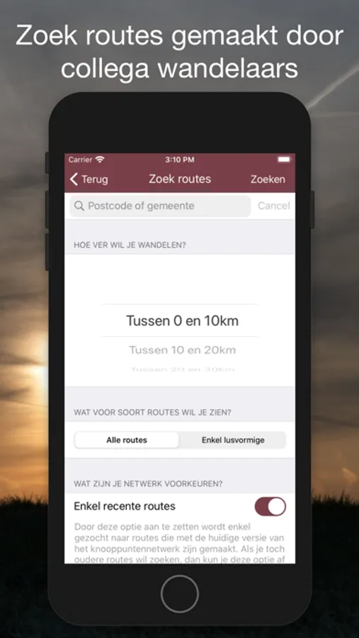 Kies het knooppunt waar je wil beginnen en eindigen en met 1 druk op de knop berekent de app een lijst van lussen met verschillende afstanden.