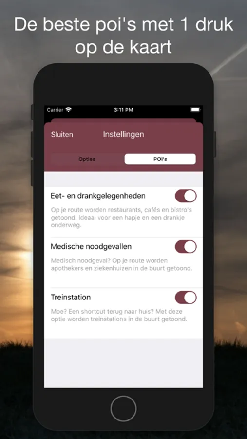 Heb je honger of dorst? Tijdens het wandelen kun je heel eenvoudig eet-en drankgelegenheden tonen op de kaart. Je kunt ook treinstations en medische faciliteiten zoals ziekenhuizen en apothekers tonen. Je kunt - binnen de app - de route bekijken tussen je huidige positie en een POI. Voor het laden van POI's is internet verbinding nodig.