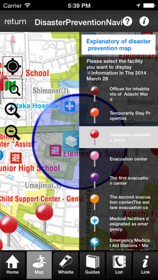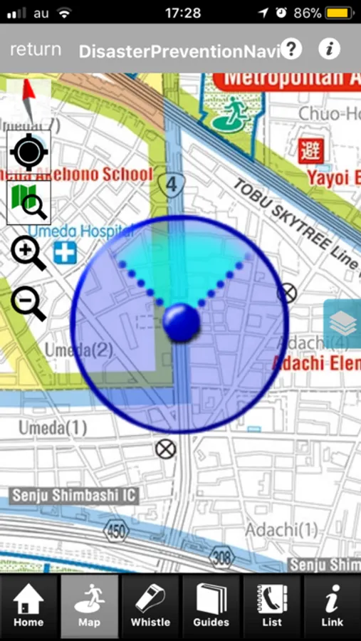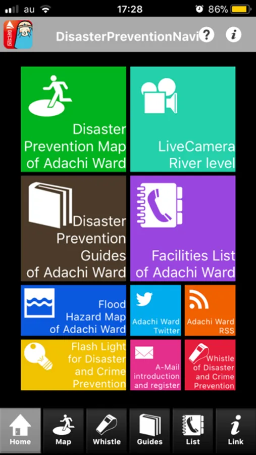 It provides information that will help you as well as facilities such as shelter , when Adachi official twitter such as disaster prevention guide , a pinch . Not to mention you live in Adachi-ku , it is an app that I would like you to use all means to residents and visitors in the shopping or the person you're commuting . Looking from the " List of facilities " and the convenience store facilities , gas stations , also designated hospital emergency ward , etc. , you can make a phone call , you can display on the map , navigation etc. can be easily . There is also a feature of the whistle and flashlight also help in crime prevention , I can be in a variety of " Adachi disaster prevention Navi" one .