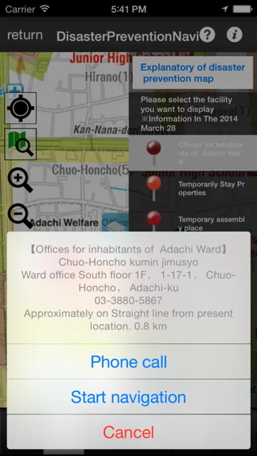 Display of Adachi official twitter display of hazard maps and disaster prevention map , navigate to the shelter , etc. , what's new Adachi and website (RSS), whistle or flashlight , usually " a function that needs to be invoked separately realization Adachi disaster prevention Navi " one . The navigation and map display , the phone is also available from the property list . Convenience store or emergency designated hospital , gas station , etc. Adachi Ward Because I can search, you can use regularly is not only disaster .