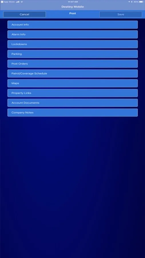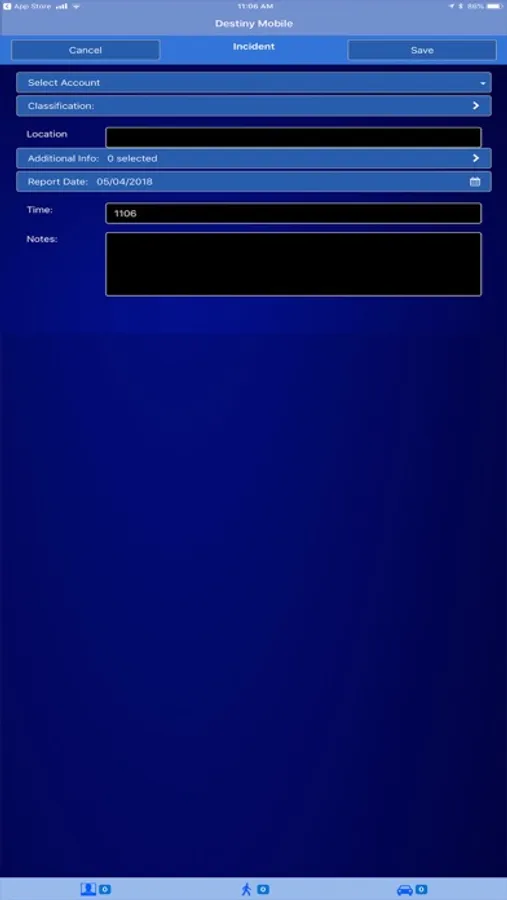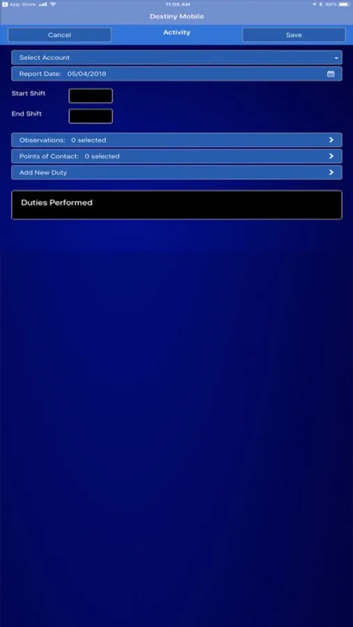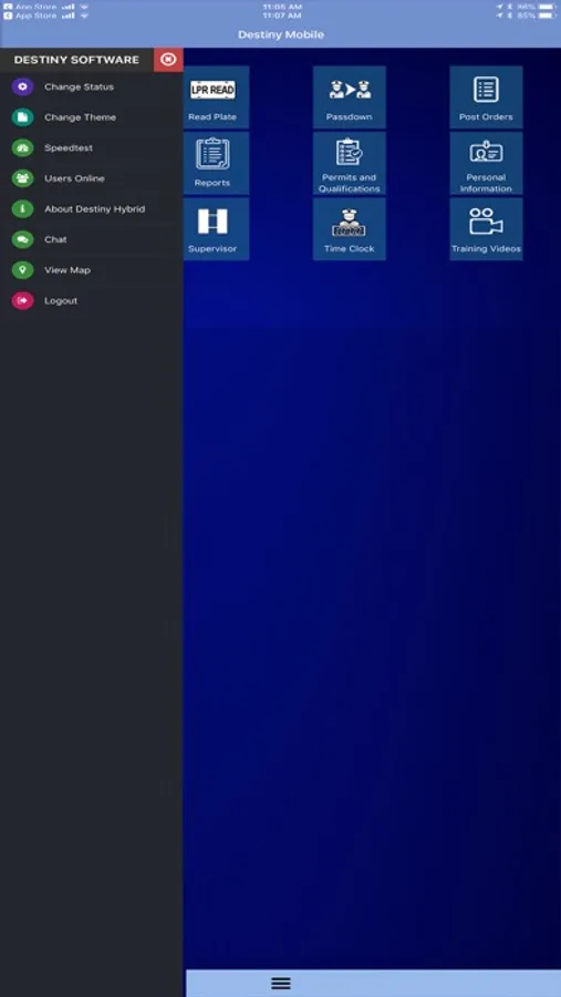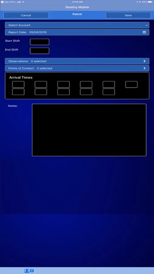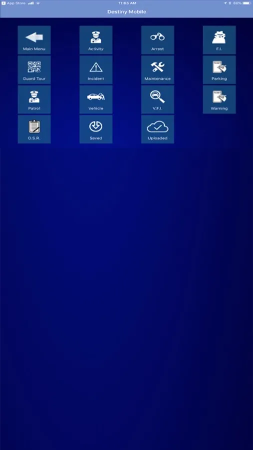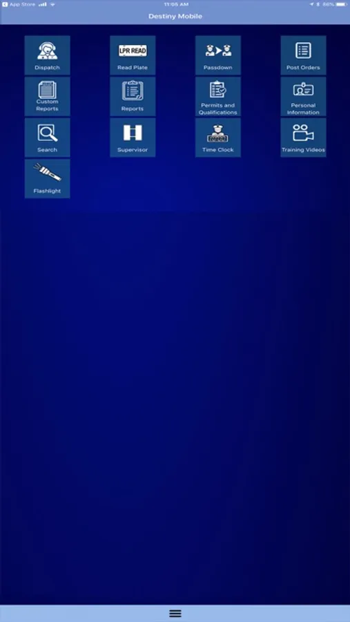 Destiny Mobile IOS Security System manages a variety of important security officer responsibilities within one application and utilizes a variety of technologies including QR codes (similar to barcodes but capable of more data), image capture, GPS Geofencing, GPS location reporting, and digital timeclock to facilitate and validate all security officer's duties.