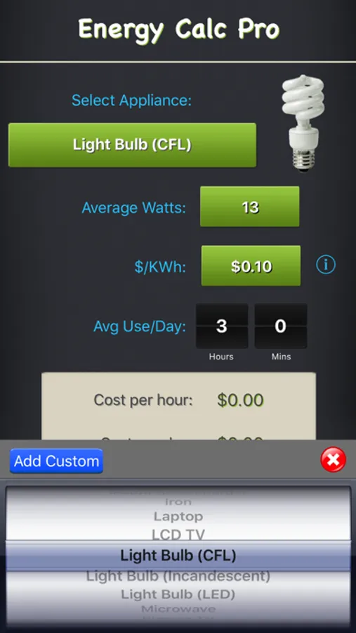 Users can customize wattage, average daily usage, and customize cost/KWh to more accurately calculate the energy cost of your specific appliance. Users can also save custom appliances with associated wattage and usage profiles.