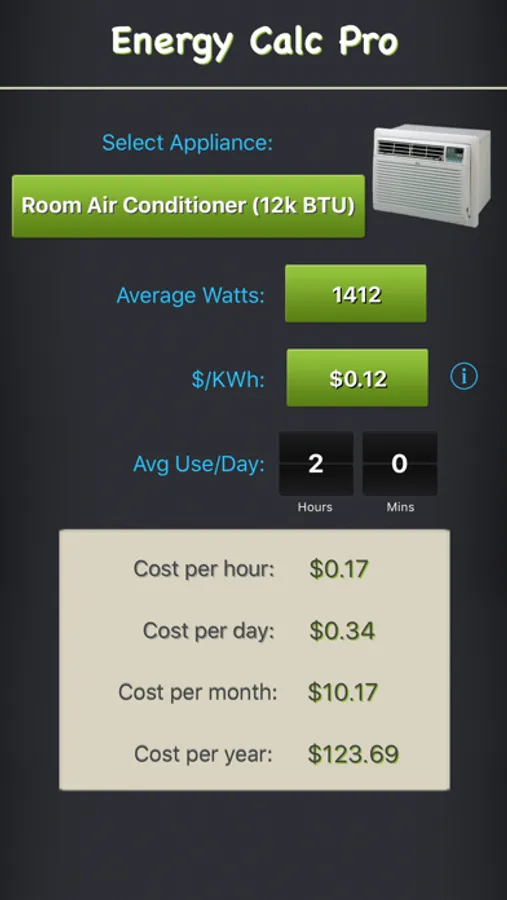 Energy Calc Pro has a built-in database of appliances with common wattage and average daily usage.